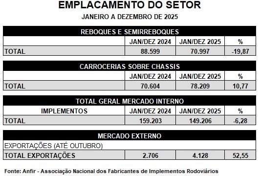 Dados divulgados pela ANFIR, apontam que a indústria de implementos rodoviários apresentou recuo de 6,28% em 2025 com relação ao ano de 2024. Em 12 meses foram emplacados 149.206 unidades ante 159.203 produtos vendidos no período anterior. Segundo a entidade, no segmento de Reboques e Semirreboques o recuo foi de 19,87%. Em 2025, foram emplacados […]